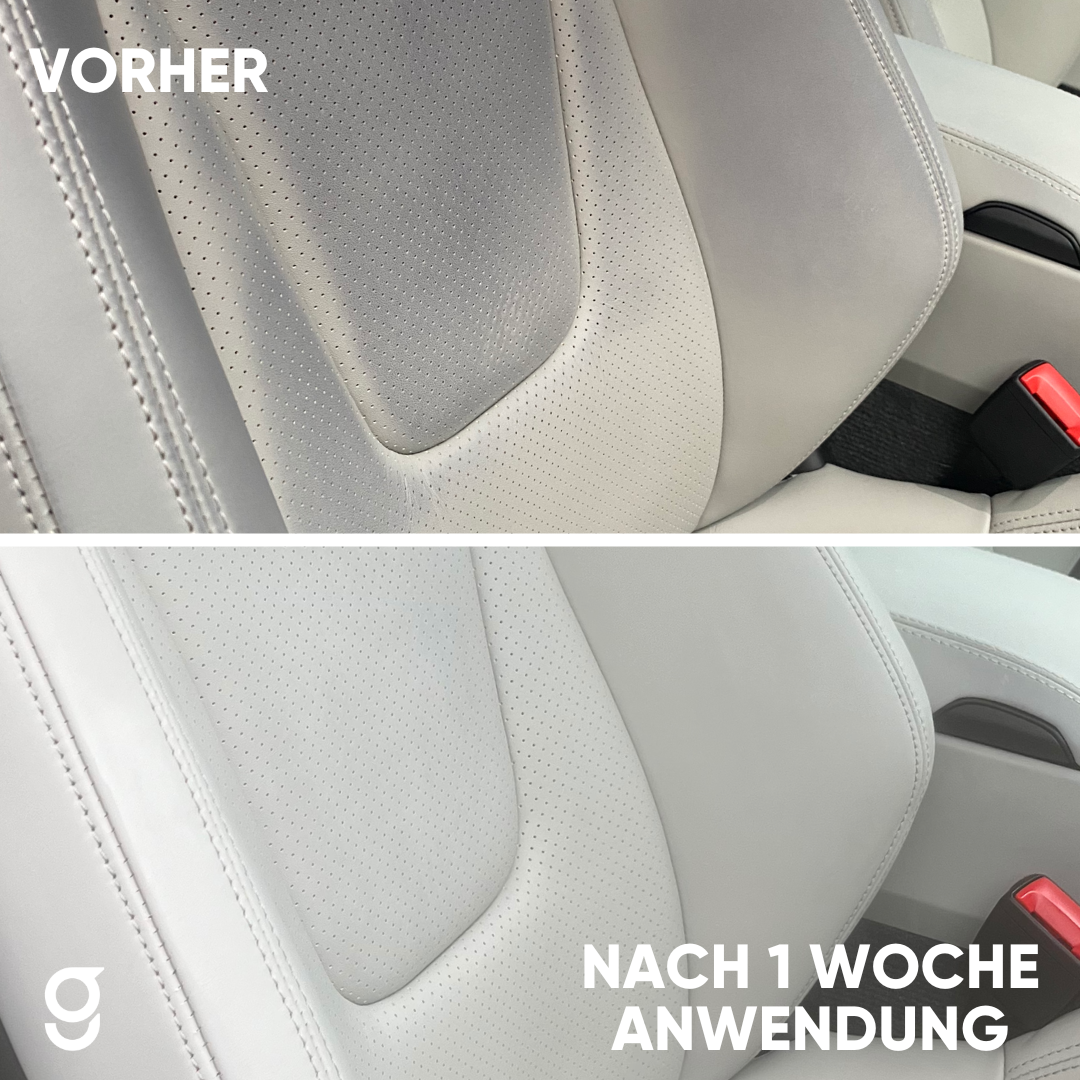 • Um die Oberfläche nicht zu beschädigen, ist es wichtig, diesem Produkt Zeit zum Einwirken zu geben. NICHT REIBEN. Dadurch kann der Decklack beschädigt werden. Tragen Sie das Produkt auf und warten Sie. In manchen Fällen können mehrere Behandlungen über mehrere Tage erforderlich sein. Die obigen Vorher- und Nachher-Fotos stammen von einem stark fleckigen Ledersitz in einem Porsche 911 Carrera, Baujahr 2023. Der Farbstoff einer Schaffelljacke wurde auf das Leder übertragen.