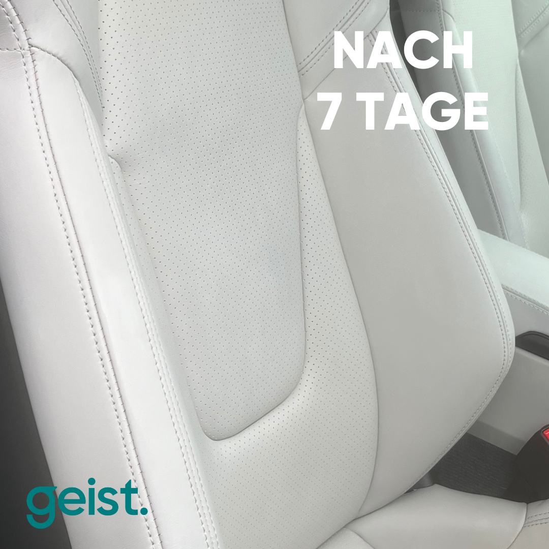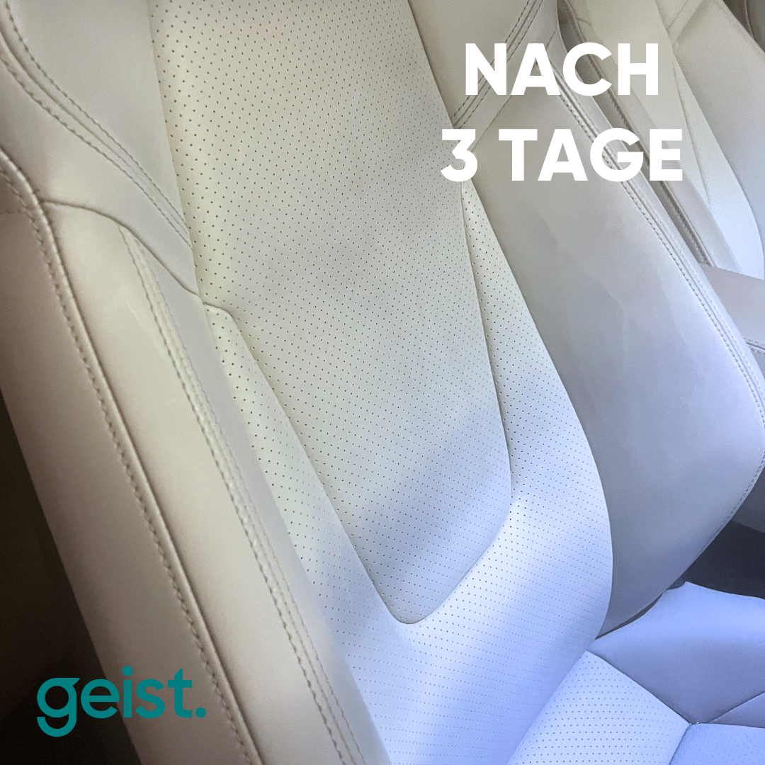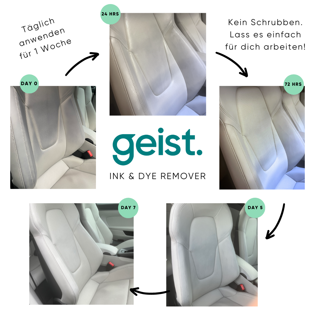 • SCHRITT 2 – Am nächsten Morgen: Reinigen Sie den betroffenen Bereich sanft mit Geist. Rapid Leder- und Kunstlederreiniger durch Aufsprühen auf ein Tuch oder mit der Geist. Lederreinigungsbürste. NICHT REIBEN.