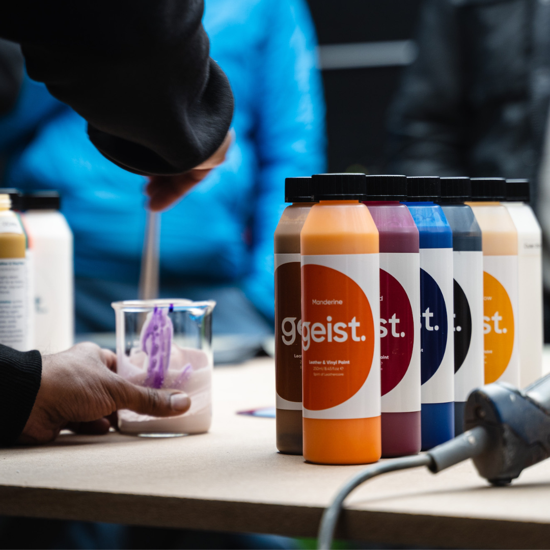Geist. Grundierung ist ein Haftvermittler, der dafür sorgt, dass sich die Lackschicht mit der Oberfläche verbindet und so eine gute und dauerhafte Reparatur ermöglicht. Nach dem Aufsprühen dringt die Grundierung mit weichen Bindemitteln in die Poren des Leders ein und sorgt für eine optimale Haftung der nachfolgenden Lackschicht und erhält so auch die Weichheit des Leders, da für die Nachbearbeitung der Oberfläche deutlich weniger Farbe benötigt wird. Die Vorbereitung (Reinigung und Entfettung) der Oberfläche vor dem Auftragen der Grundierung ist der Schlüssel zur Gewährleistung einer rundum guten Reparatur. Die Grundierung hinterlässt eine leicht klebrige Oberfläche, und das Auftragen einer Schicht mit einem Schwamm auf Kratzer, Risse und Löcher usw. sorgt für eine gute Haftung des Lederspachtels und anderer verwendeter Reparaturmaterialien. Die Grundierung kann auch verwendet werden, um Geist. Leder- und Kunstlederfarbe zu verdünnen oder transparenter zu machen, was besonders beim Nachfärben von Anilin- oder Semianilinleder nützlich sein kann. Wenn Sie eine größere Fläche bearbeiten, ist es einfacher und schneller, die Grundierung häufig aufzusprühen. Sie kann mit einem Schwamm oder Pinsel auf einer kleineren Fläche aufgetragen werden.