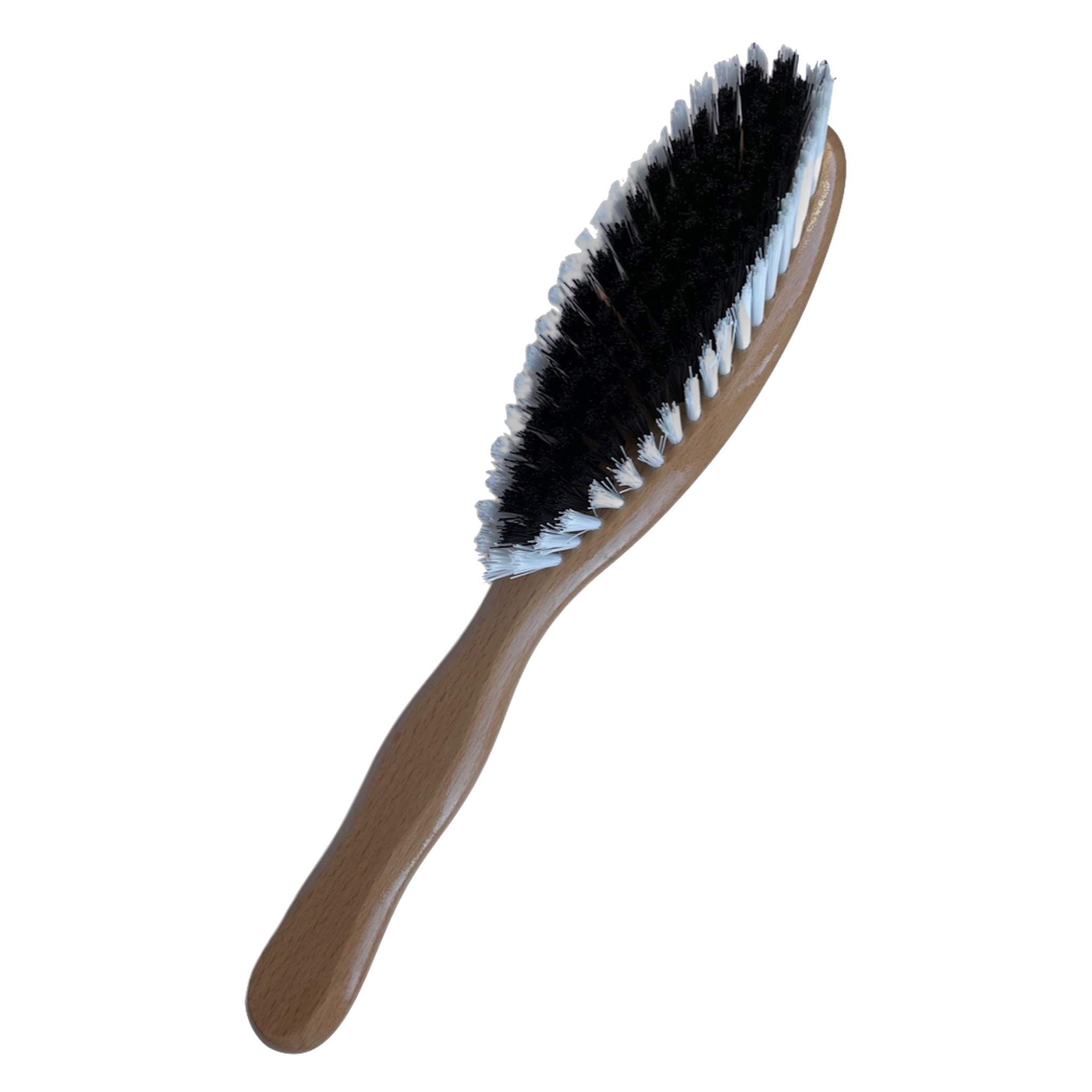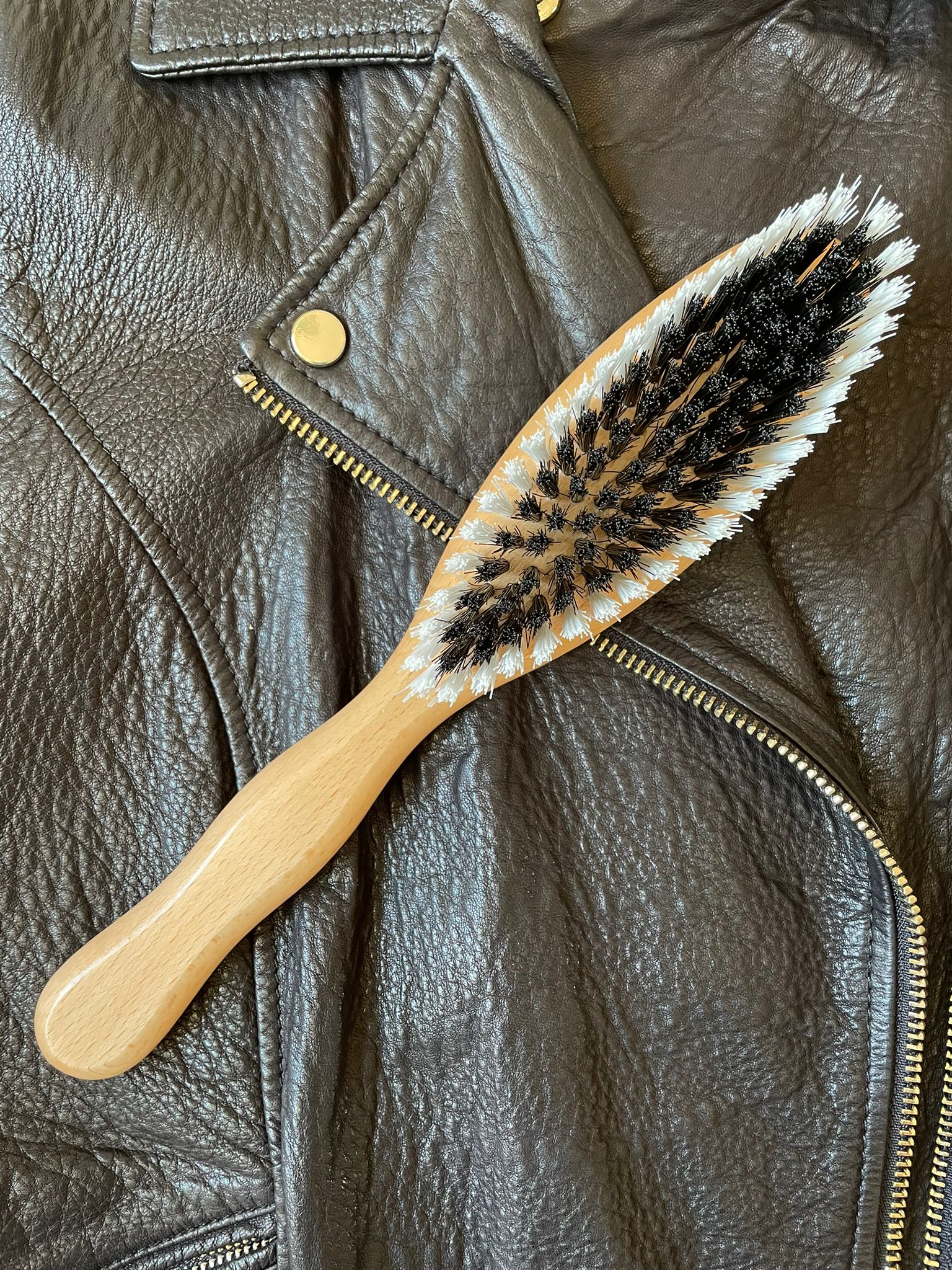 Eine robuste, gut konstruierte Bürste in guter Größe mit lackiertem Holzgriff, die für eine Vielzahl von Zwecken verwendet werden kann. Hauptsächlich zum Abbürsten von Rauleder- und Nubuklederbekleidung konzipiert, kann aber auch auf verschiedenen anderen Oberflächen verwendet werden, die eine schnelle Reinigung erfordern. Synthetische Borsten bieten die richtige Steifigkeit, um Staub, Fusseln und Flusen von Kleidung und Kleidungsstücken zu entfernen, die längere Zeit nicht benutzt wurden. Die Bürste ist auch ideal zum Entfernen von losen Rückständen und Krümeln von Stoffkleidung oder Alcantara, Samt, Wolle und Leinen.